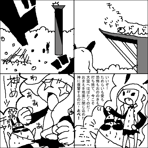 ともだちの視界を埋め尽くした強烈な光たちは、ずっとずっとずっと、つづいてゆく。おおきなかたまり、ちいさなかたまり。そのうち2つのかたまりはふわっとつながって、やわらかいかたまりになってともだちをはこんでいった。