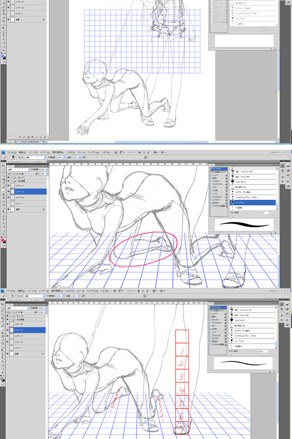 背景の作画で良く使われるグリッド法ですが、人物を描くときにも便利でいいです。この絵は背景無しのつもりなので、パースシートのレイヤーは消してしまいましたが、背景を後から描く場合にはとっておいたほうが良いかもです。