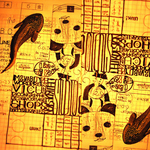 今作りたいものに対してなにかふさわしいイメージなんかを探すときは、とにかくどんどん関連の情報を書いてゆくのがよろしいでス。ちょっとくらい主旨と違ったってへいき。ちょっとでもつながりがあったらいっしょの空間に書いて、ならべてゆきまス。どうせなら字の向きや大きさ、形なんかを変えてちょびとデザインしてみるとあとで見たときにかっちぇーでス。