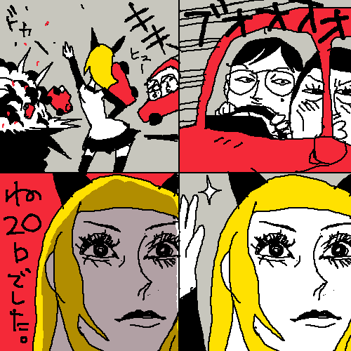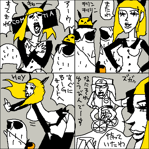ワーウ!たけひこ!!と思って近寄っていくと、その手前にボードがドミノみたいに並んどって、そこに絵が描いてあった。けっこうな枚数があり、ちゃんとストーリーになっとう。これを読みながら進んでいくと、一番奥のでっけえ雄彦ーー!”!にたどり着くとゆう趣向だ。すてきね。